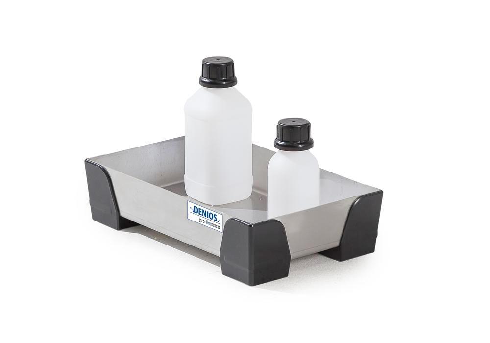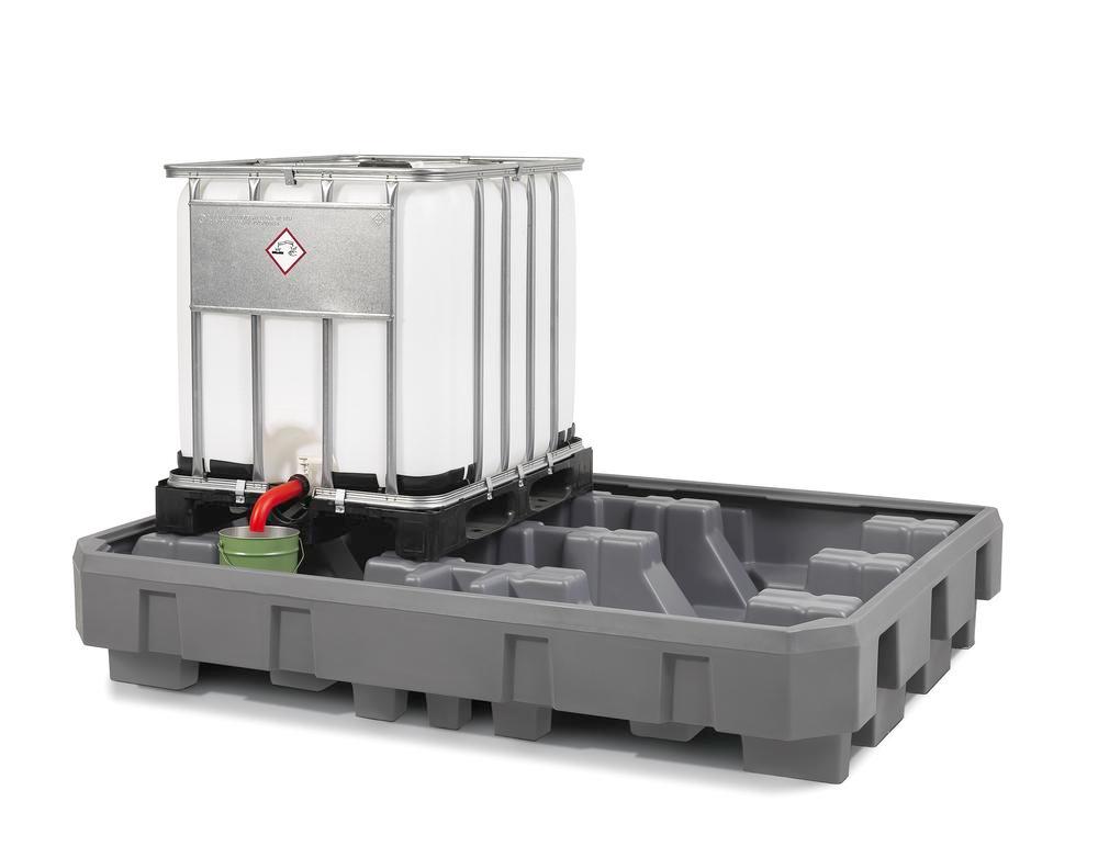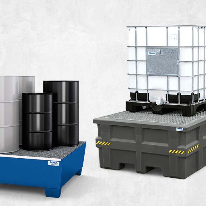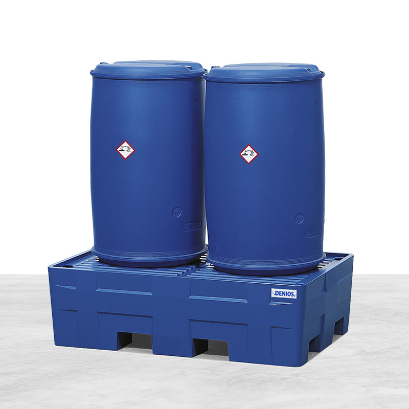 DENIOS spill pallets are the products of choice for the legally compliant storage of water-polluting substances of all classifications. A wide range of collection volumes is available, from small quantities, such as 5 liters, to large quantities, such as 1,000 liters. Grids made of plastic, galvanized steel and stainless steel are also available as an option.